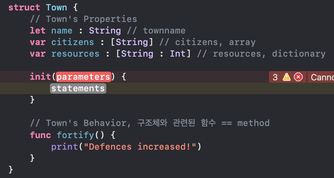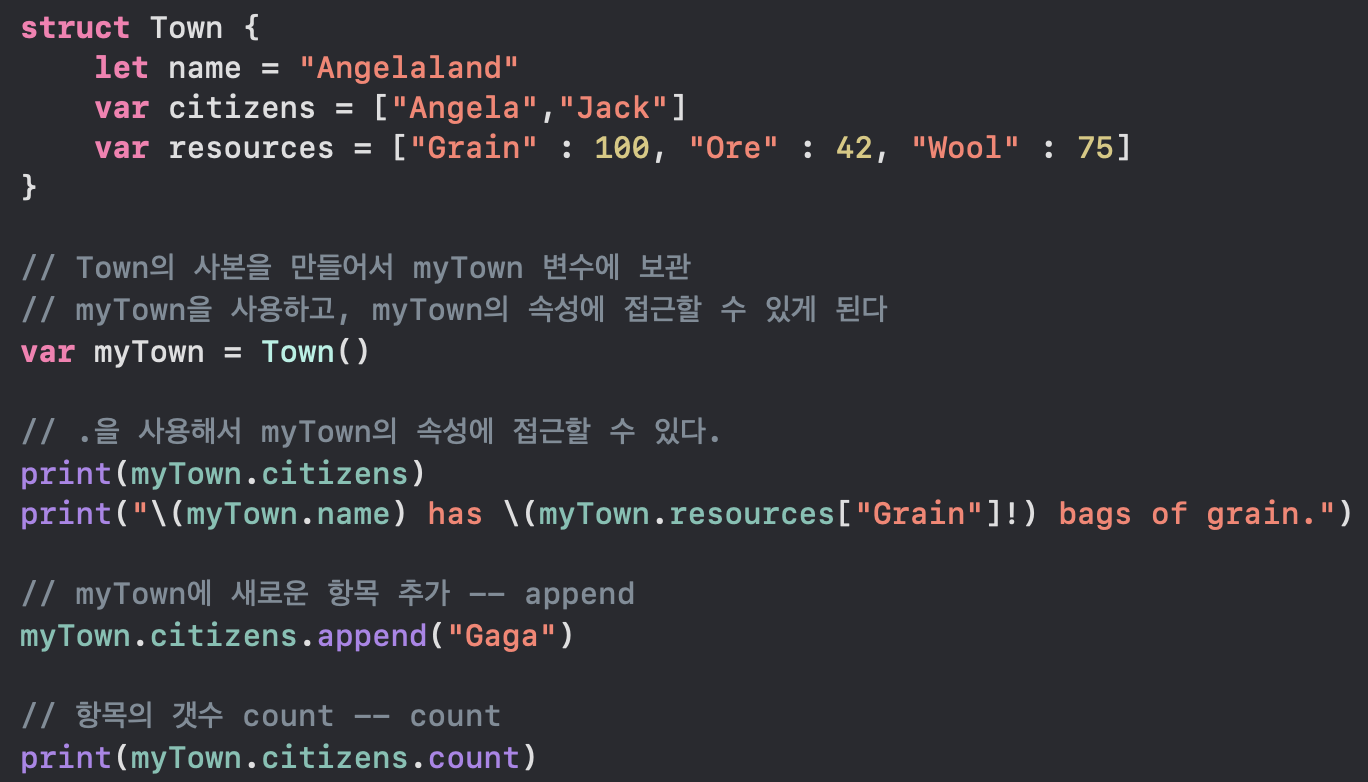 미리 빌드된 다른 자료형과 마찬가지로, structure의 이름도 대문자로 시작해야 한다. - Town