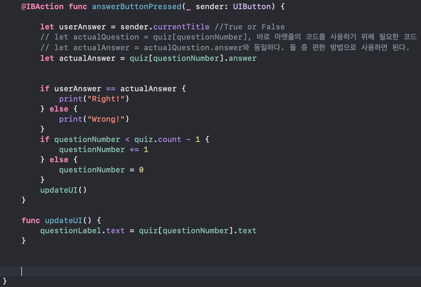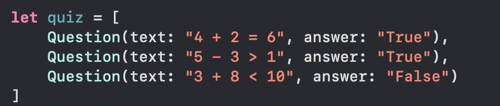 이제 ViewController.swift에서 quiz 배열의 항목들을 구조체의 배열로 변경해준다.