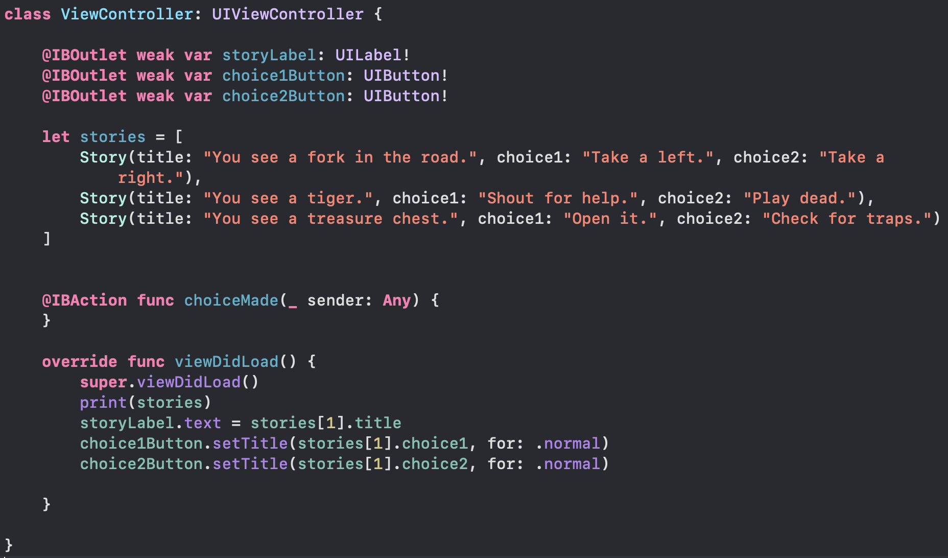 3개의 스토리/선택지를 각각 따로 만들지 않고 배열을 사용해 만들었으며,