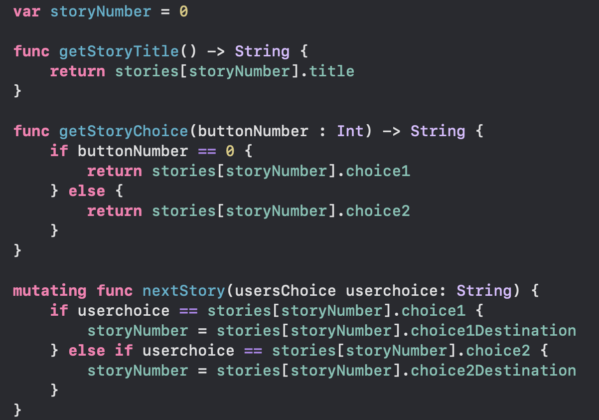 nextStory() method에서 storyNumber 대신 choice1Destination / choice2Destination을