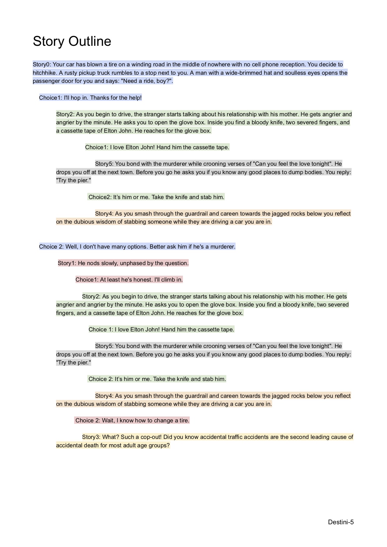 title: "As you begin to drive, the stranger starts talking about his relationship with his mother. He gets angrier and angrier by the minute. He asks you to open the glovebox. Inside you find a bloody knife, two severed fingers, and a cassette tape of Elton John. He reaches for the glove box.",