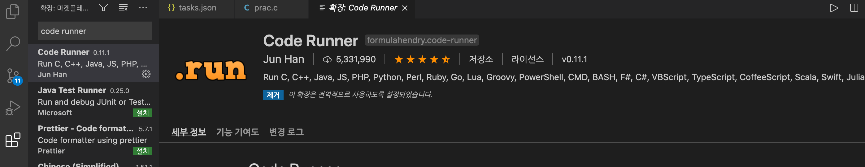 run code 또는 code-runner.run 검색,
