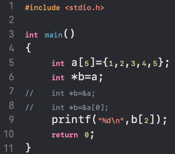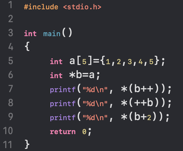 8번째 줄에서 b의 값인 두 번째 주소값에서 한 칸 이동후 출력, 3을 가리키게 됨
