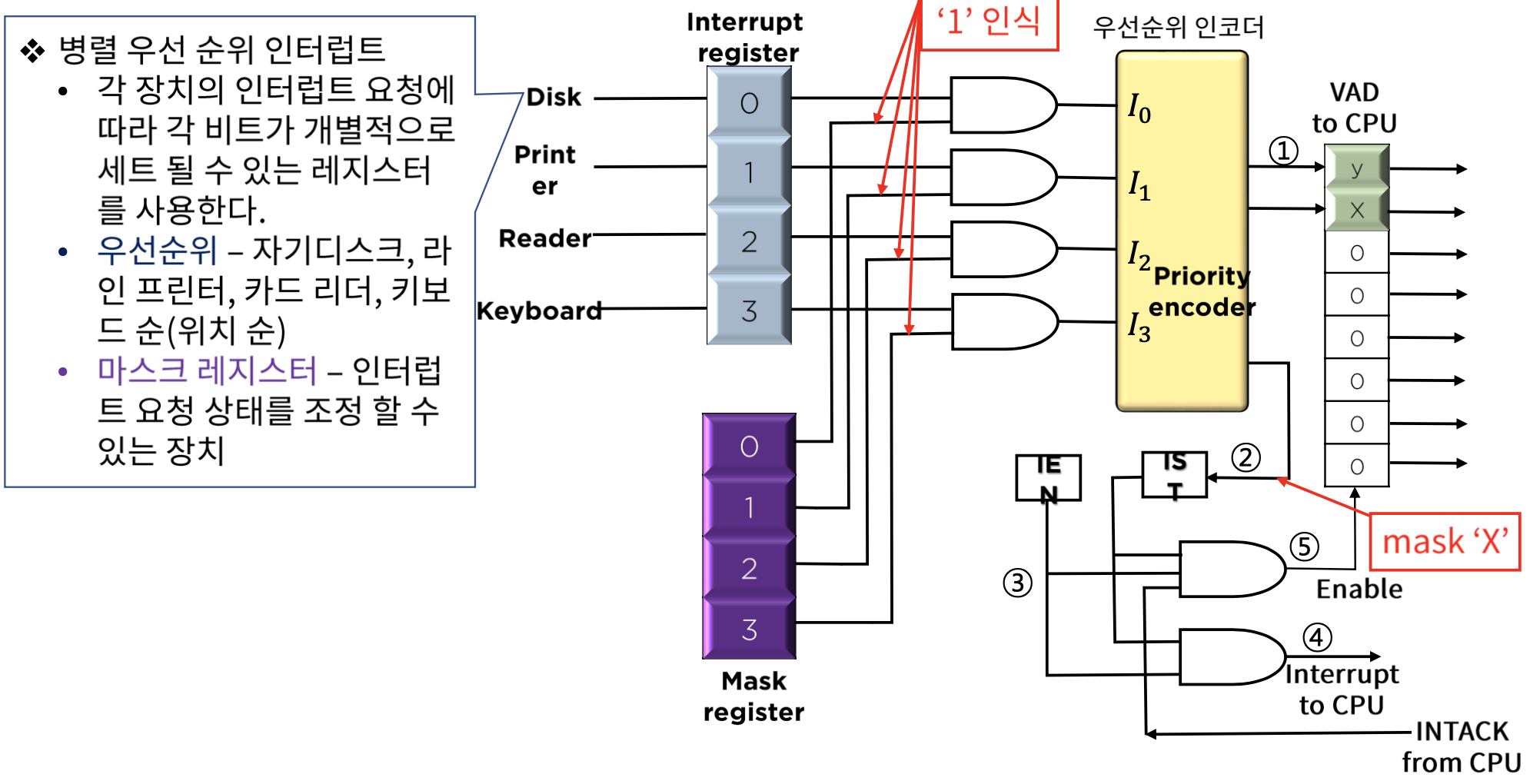 Interrupt register, Mask register - AND gate를 통해 mask register=1 일 때만 요청한 인터럽트 처리된다.