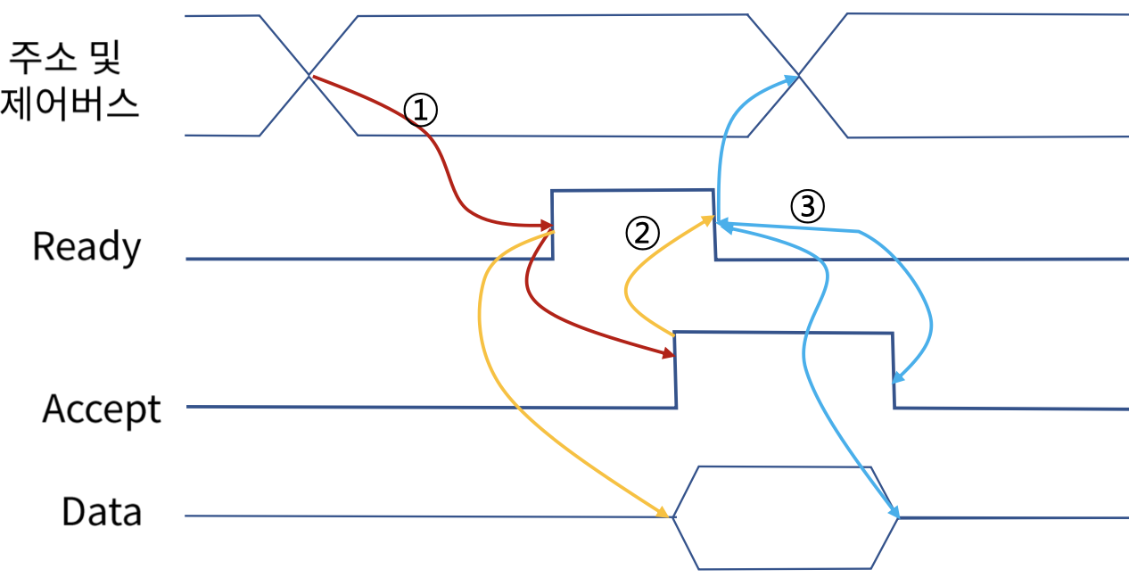 1. cpu로부터 I/O 제어기를 통해 해당장치의 Ready 신호 활성 -> I/O 전송 요구 ready 신호 활성 -> Ready 신호에 대한 응답으로 Accept 신호 전송