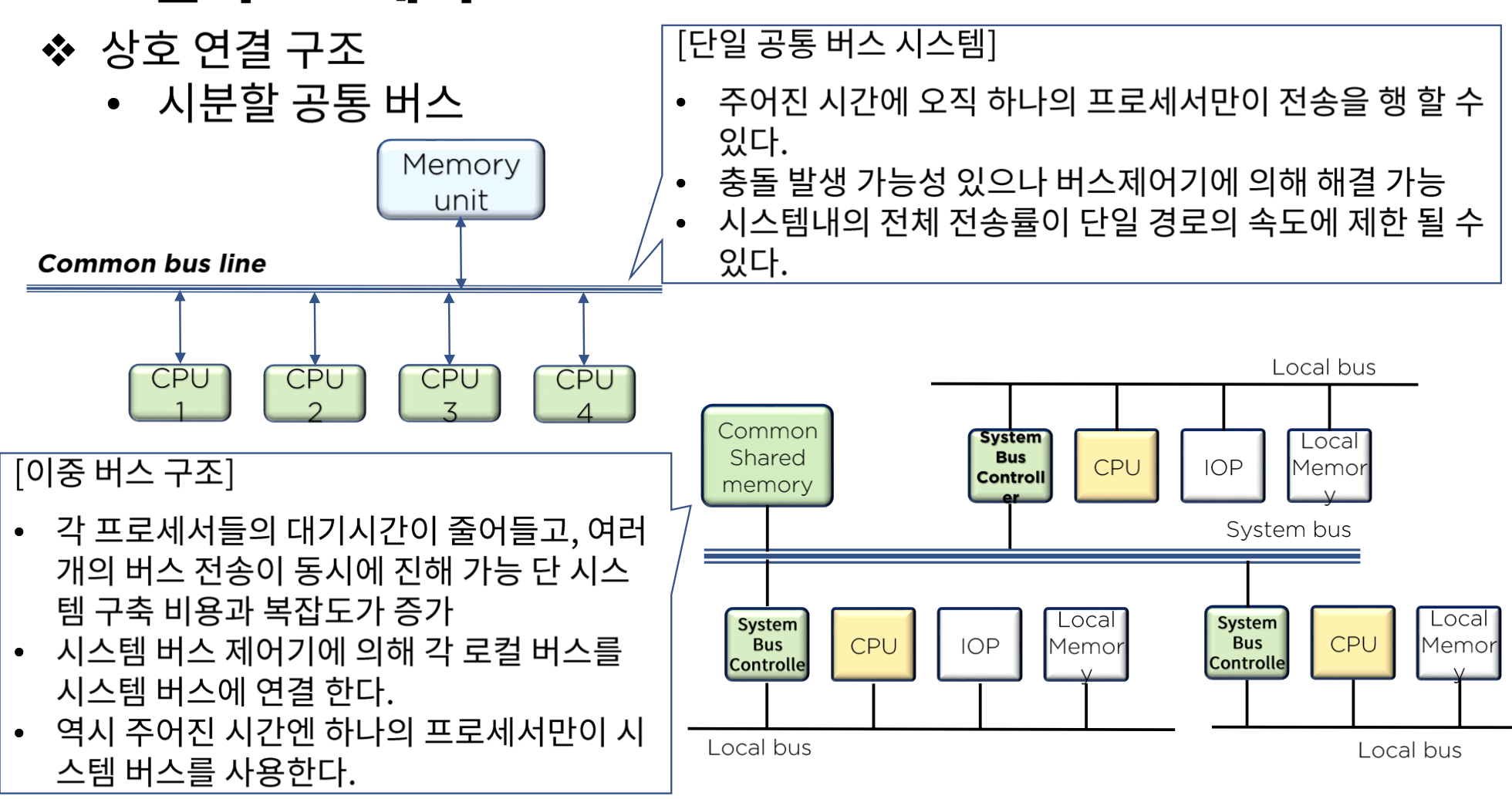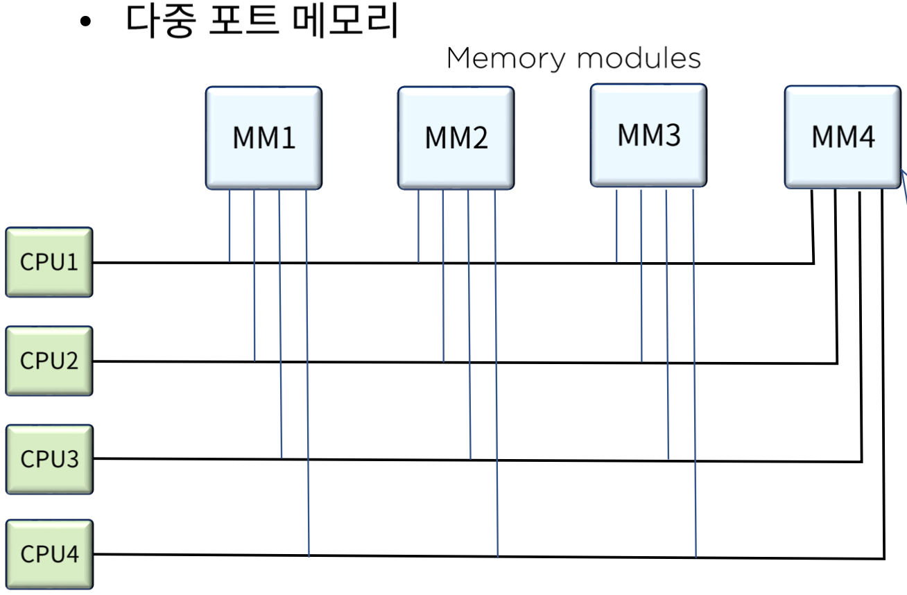 CPU 또는 IOP (I/O processor)와 각 메모리 모듈이 버스라인을 갖는다.
