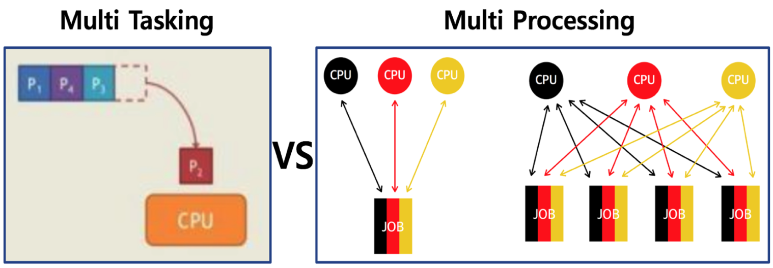 멀티 프로세싱 - 여러 cpu에 하나의 프로그램을 병렬로 실행해서 실행속도를 극대화