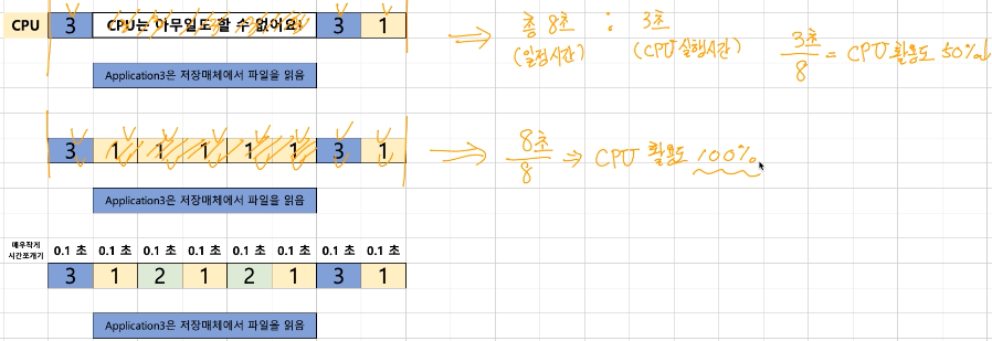 응용 프로그램은 온전히 cpu만을 사용하는 것이 아니라, 다른 작업을 중간에 필요로 하는 경우가 많다.