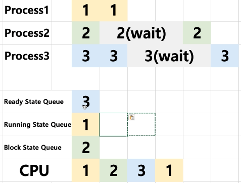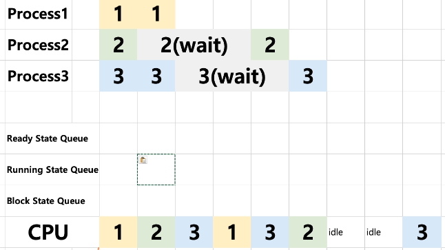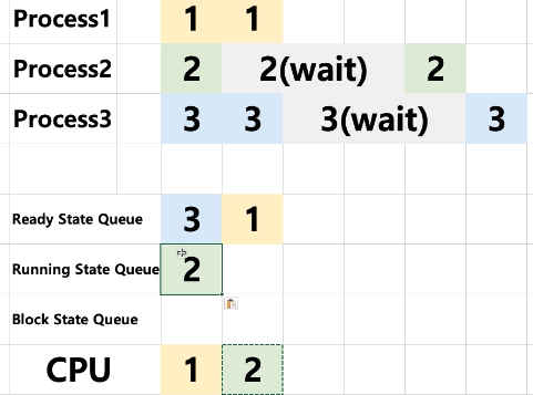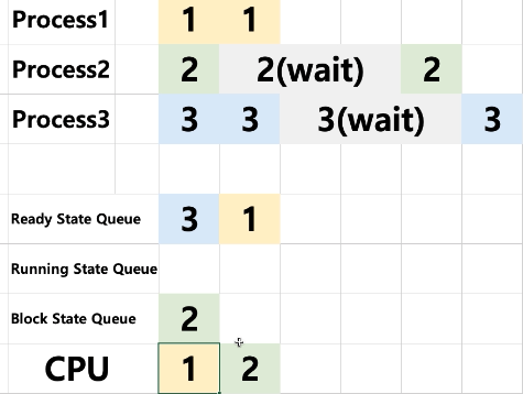 (ready state queue 는 1-2-3 에서 1이 먼저 실행되고 2-3이 남은 상태에서 다음 ready state queue를 나타냄.)