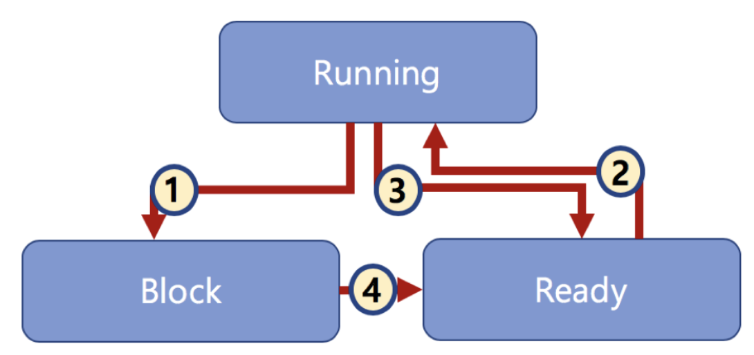 위의 그림을 참고하여 아래 순서대로 진행된다. (running state에서 시작하는 상황이라고 가정)