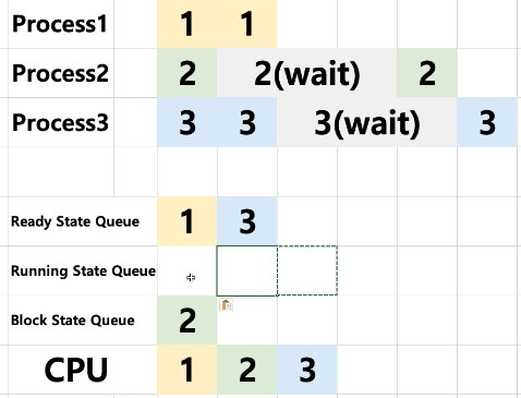 1. 시작시점에 1,2,3 process 모두 ready state -> process2 block state (가정)