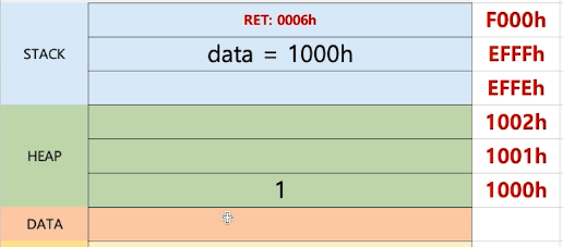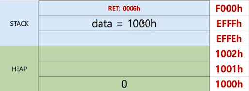 -> STACK-data가 가리키는 주소값 (1000h)의 값이 1로 바뀐다.