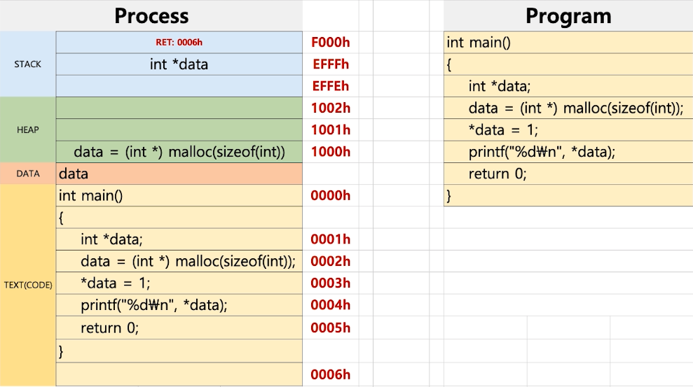 - 프로세스 구조 : Stack, HEAP, DATA (BSS,DATA), TEXT(CODE)