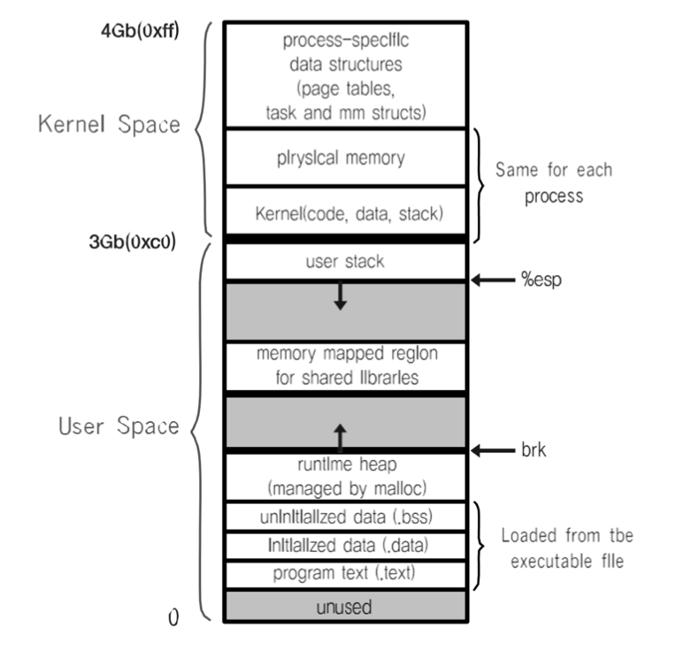 위의 예제에서는 0~3Gb : 실제 프로그램이 쓰는 공간, 3~4Gb 운영체제 코드가 들어가는 공간으로 부여되었다.
