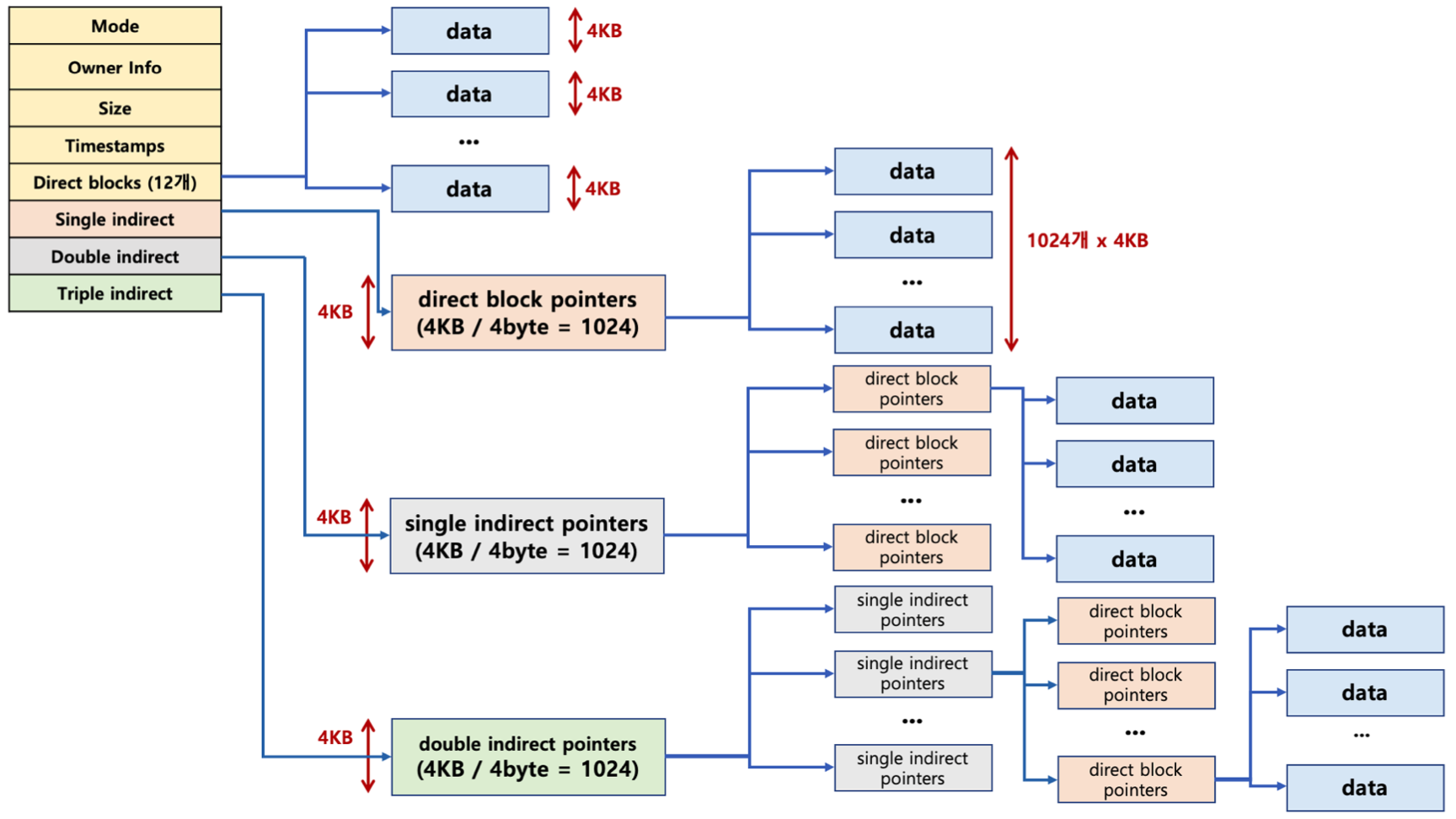 각각 1024개의 데이터블록을 가리키는 주소 를 가리키는 주소를 갖게 된다.