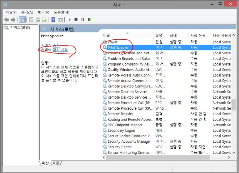 오른쪽 목록에서 Print Spooler 클릭 후