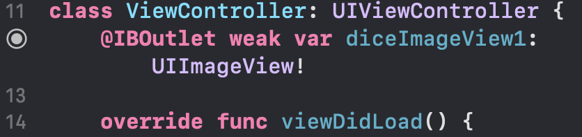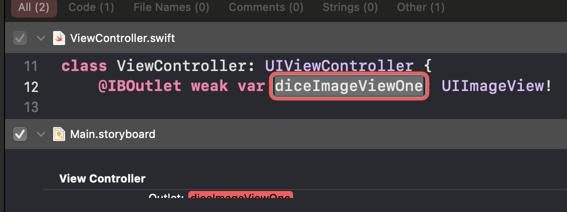 방금 만든 IBOutlet~ 부분의 이름을 diceImageViewOne으로 수정할 경우,