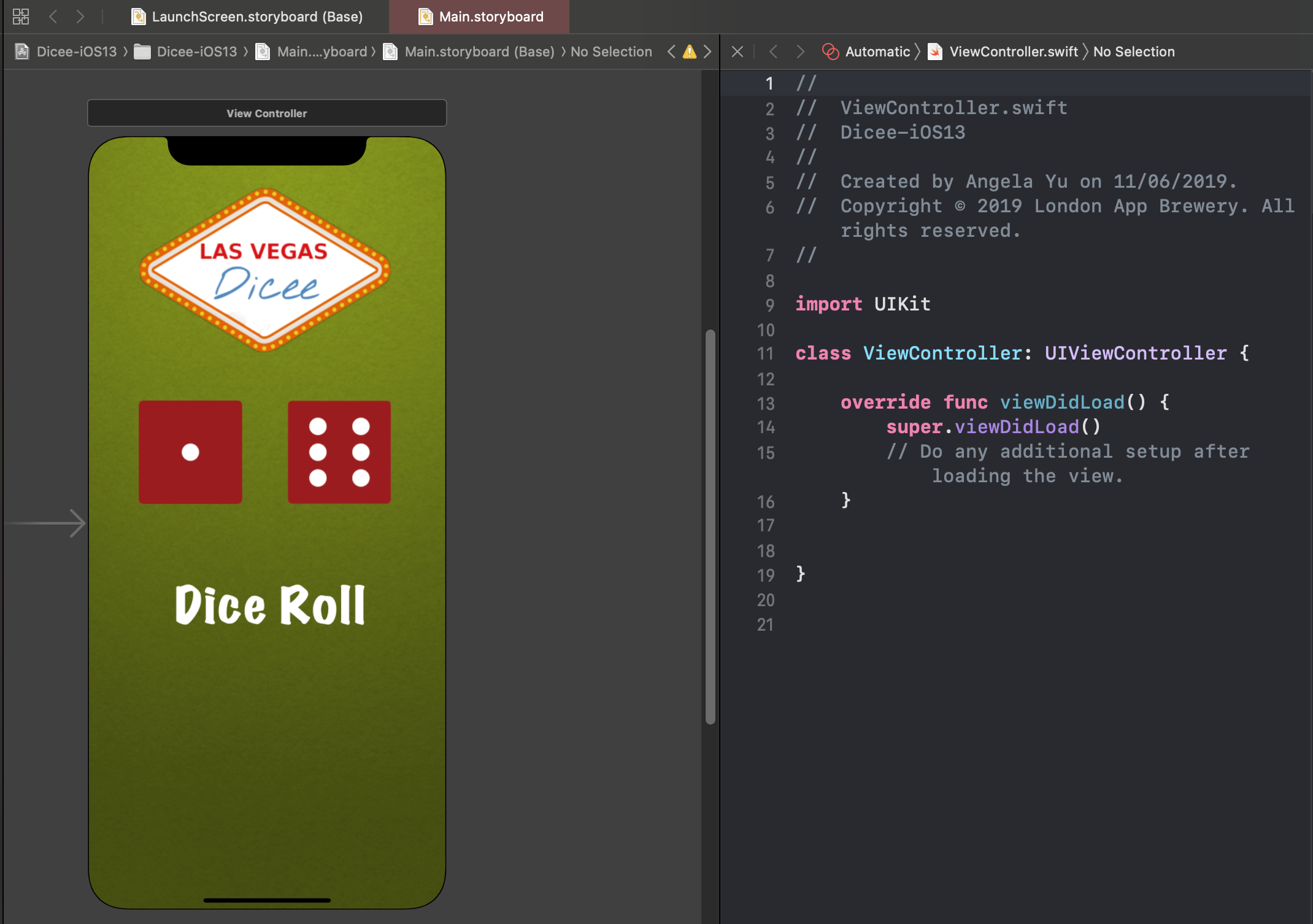 오른쪽에는 ViewController.swift 화면이 나타나게 된다.